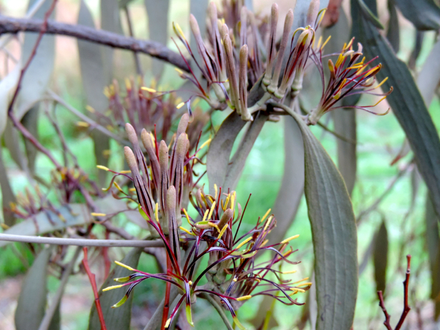 SOME clearing on the garden’s western boundary last week presented an opportunity closely to look at Amyema pendula, one of Australia’s extraordinary species of mistletoe. On the hill above the garden grows a sentinal Eucalyptus microcarpa grey box. It is laden with mistletoe, the plant that mimics its host – so much that on some species, such as Acacia longifolia ssp. longifolia Sydney wattle, it is almost difficult to tell host from guest. Many believe it to be a pest that can kill trees and shrubs, but in a 25-year study underway at Charles Sturt University in nearby Albury ecologist David Watson is setting out to separate myth from mistletoe.