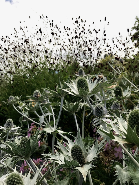 Home from a Sydney sojourn to find Turkish, North African and southwestern European Eyringium bourgatii blooming in front of rocketing Calamagrotis x acutiflora ‘Karl Foerster’ – a combination we found at the Royal Horticultural Society’s Wisley in its exceptional long double border in the northern summer of 2017.