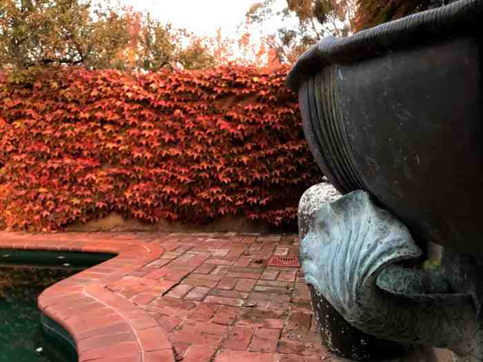 1. Berberis ‘Firecracker’ (our name for it as it’s unidentified). 2. Parthenocissus tricuspidata, Pyrus ussuriensis and Prunus mume. 3. Cyrilla racemiflora, Salvia apiana, Pyrus (unknown), Cercis canadensis. 4. Parthenocissus tricuspidata on the pool wall.